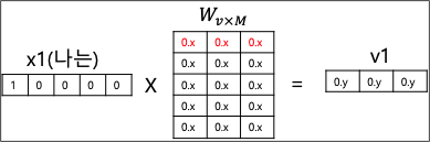 입력층의 가중치 행렬은 단어갯수 V와 Projection Layer의 임베딩 차원인 M의 크기의 조합이 된다. (VxM 차원의 행렬) 다음은 상기 예의 입력 x1에 대해서 연산하는 것을 묘사한 그림이다. (v=5, M=3으로 가정)