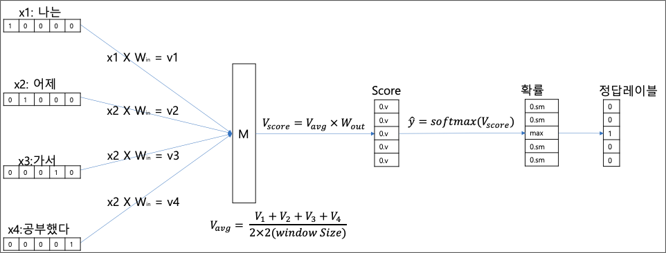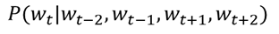 즉 주변 2개의 단어가 나타났을 때 해당 단어가 나타날 확률이 되는 것이다.