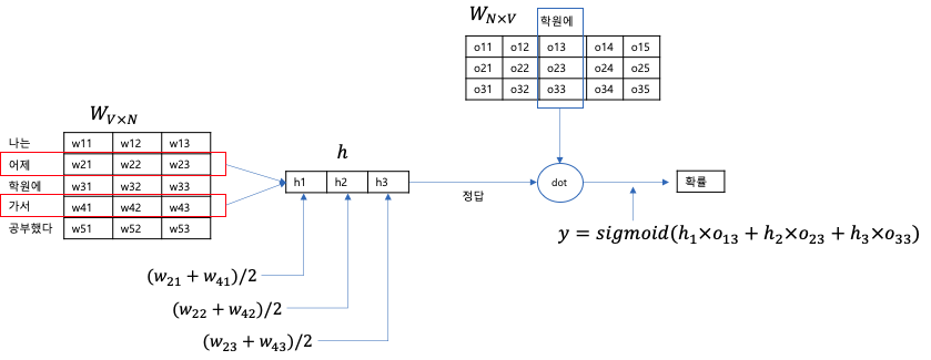 입력의 경우 one-hot vector이기 때문에 가중치 Win의 특정 행의 값으로 바로 표현이 가능하다. "어제","가서"의 두 주변단어에 대해서 해당 행을 더하고 0.5를 곱하면 Projection Layer의 출력이 되고, 여기에 Wout에서 중심 단어의 출력에 해당하는 열을 dot 연산하고 sigmoid 함수를 적용하면 "어제", "가서"라는 주변단어에 대한 "학원에"가 나올 확률을 나타나게 된다.