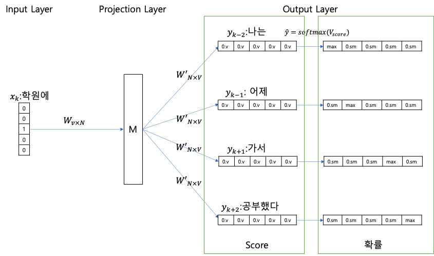 Sliding Window는 학습을 위해서 주변 단어 크기(window)에 따라 말뭉치를 Sliding 하면서 중심 단어의 주변 단어들을 보고 해당 단어들에 대해서 벡터값을 업데이트 하는 방식이라고 할 수 있다. 다음은 중심단어가 "학원에"이고 윈도우가 2인경우 신경망의 입, 출력 구조이다.