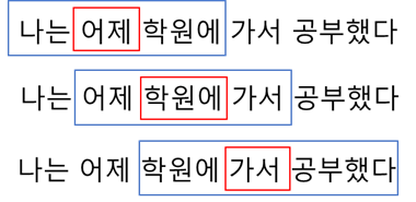 CBOW는 주변에 있는 단어들을 가지고 중간에 있는 단어들을 예측하는 방법이다. 예를 들어 "나는 어제 학원에 가서 공부했다" 라는 문장에서 {"나는","어제","가서","공부했다"} 라는 단어로부터 "학원에"를 예측해야 하는 것이다. 이때 예측해야 하는 대상인 "학원에"를 중심단어(Center Word)라고 하고 예측을 위한 주변 단어를 주변단어(Context Word)라고 한다. 중심 단어의 앞, 뒤로 몇개의 단어를 볼 것인지에 대한 범위를 window라고 한다. 즉 window는 주변 단어의 크기 또는 맥락(문맥, Context)크기이다. 앞의 문장 예에서 윈도우가 2이고 예측 단어가 "학원에"라고 한다면 문맥단어는 "나는","어제","가서","공부했다"가 된다. 이 데이터를 만들기 위해서 슬라이딩 윈도우(sliding window)를 활용한다. (다음 그림은 윈도우를 1로 해서 슬라이딩 윈도우로 학습하는 예)