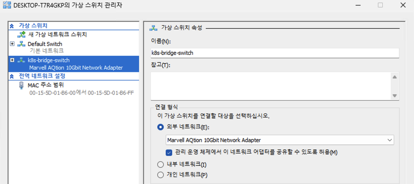 - 네트워크: 가상 스위치 관리자에서 외부 네트워크 브릿지를 생성한다. (k8s-bridge-switch)