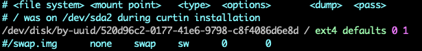 /etc/fstab에서 swap.img에 대한 부분을 주석 처리 한다. (swam.img 라인 앞에 # 추가)
