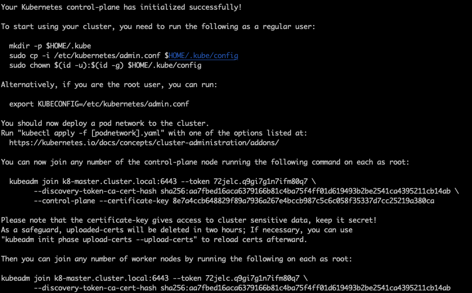 | $sudo kubeadm init --pod-network-cidr=10.244.0.0/16 --upload-certs --control-plane-endpoint=k8-master.cluster.local |