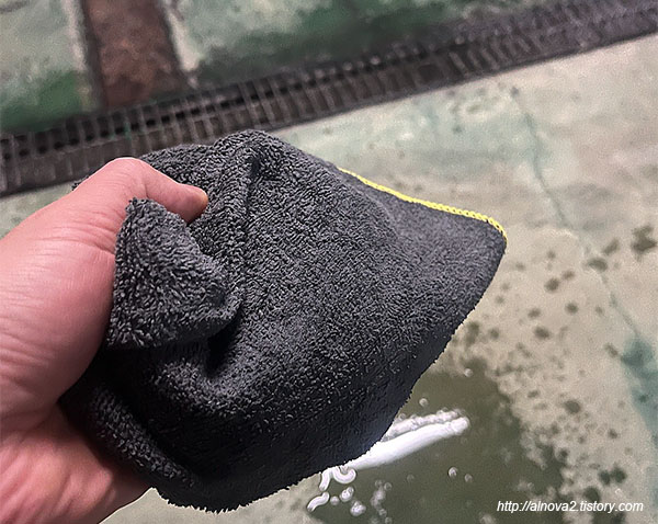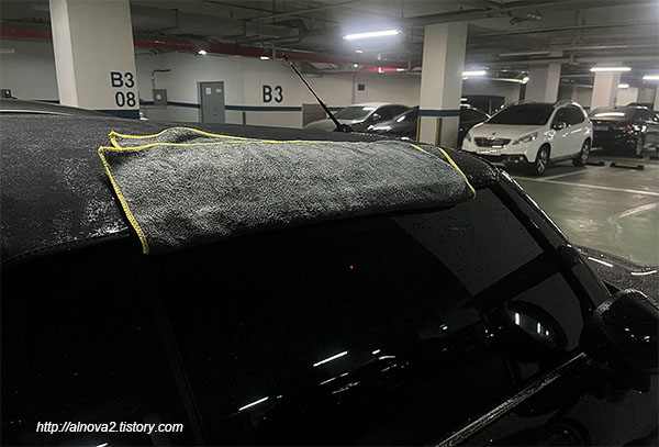 세차 과정중에 아마 가장 시간이 많이 걸리고, 중요한 단계인것 같다. 드라잉타월로 위에서 아래로 물기를 닦아 준다. 이때 박박 문지르듯이 닦으면 차량에 기스(스월)이 생기니 살살 다월로 물기를 위 아래로 닦아야 한다.