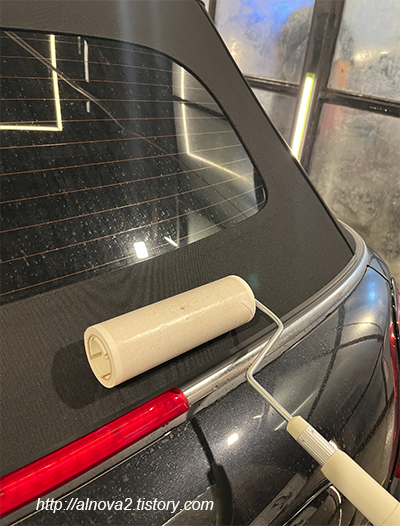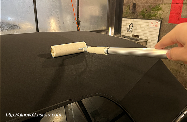 돌돌이 찍찍이로 소프트탑의 먼지를 제거해 준다.