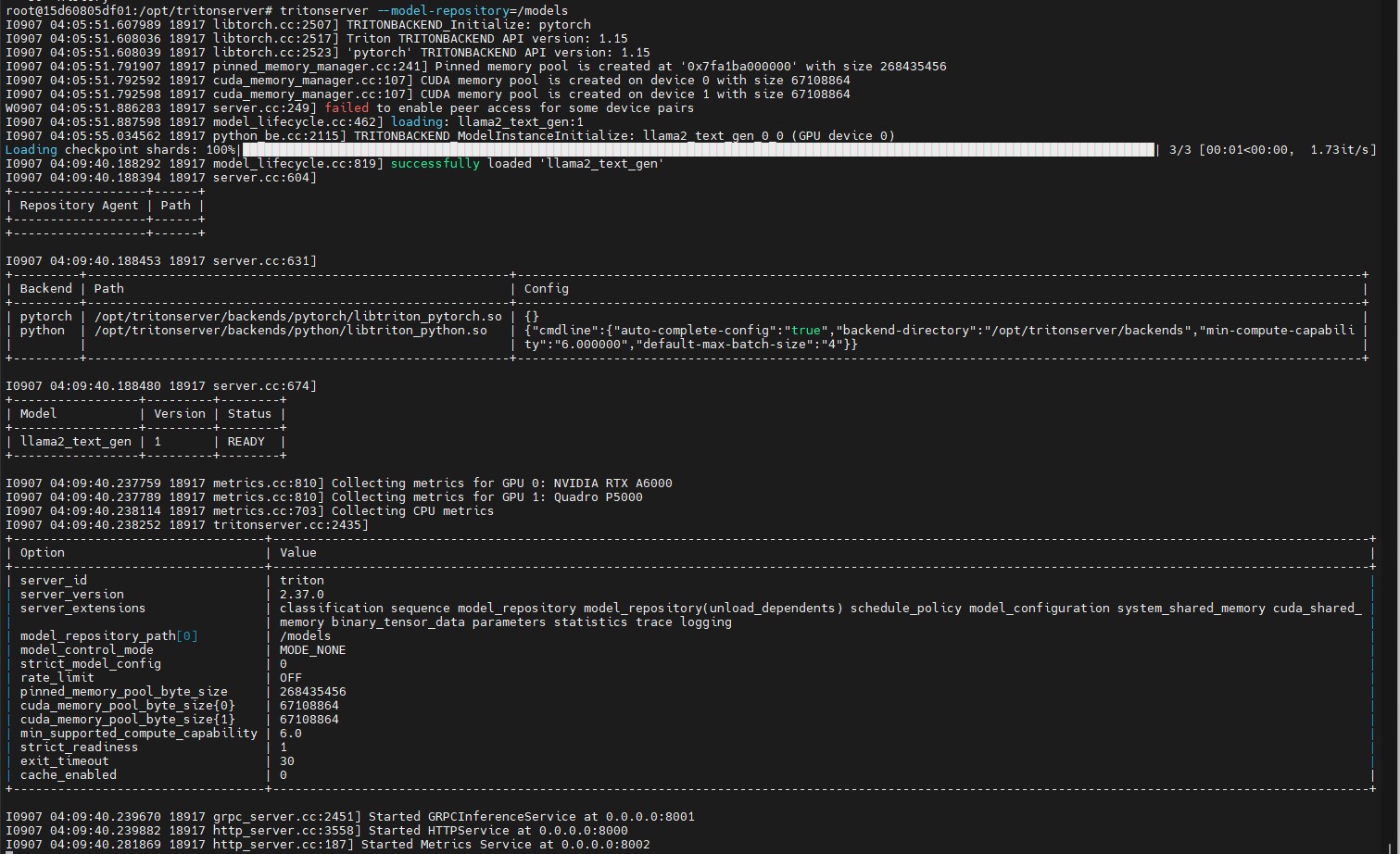 | $ curl -v http://localhost:8000/v2/models/llama2_text_gen/config * Trying 127.0.0.1:8000... * TCP_NODELAY set * Connected to localhost (127.0.0.1) port 8000 (#0) > GET /v2/models/llama2_text_gen/config HTTP/1.1 > Host: localhost:8000 > User-Agent: curl/7.68.0 > Accept: */* > * Mark bundle as not supporting multiuse < HTTP/1.1 200 OK < Content-Type: application/json < Content-Length: 885 < * Connection #0 to host localhost left intact {"name":"llama2_text_gen","platform":"","backend":"python","version_policy":{"latest":{"num_versions":1}},"max_batch_size":0,"input":[{"name":"prompt","data_type":"TYPE_STRING","format":"FORMAT_NONE","dims":[-1],"is_shape_tensor":false,"allow_ragged_batch":false,"optional":false}],"output":[{"name":"generated_text","data_type":"TYPE_STRING","dims":[-1],"label_filename":"","is_shape_tensor":false}],"batch_input":[],"batch_output":[],"optimization":{"priority":"PRIORITY_DEFAULT","input_pinned_memory":{"enable":true},"output_pinned_memory":{"enable":true},"gather_kernel_buffer_threshold":0,"eager_batching":false},"instance_group":[{"name":"llama2_text_gen_0","kind":"KIND_GPU","count":1,"gpus":[0],"secondary_devices":[],"profile":[],"passive":false,"host_policy":""}],"default_model_filename":"model.py","cc_model_filenames":{},"metric_tags":{},"parameters":{},"model_warmup":[]}(pytorch-gpu) dev@dev-new-workstation-0: |