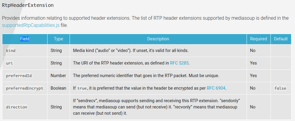 getRouterRtpCapabilities 메시지는 서버의 router 객체의 rtpCapabilities 멤버 변수에 기술된 내용을 클라이언트로 전달해 주는 것이다. (router.rtpCapabilities) rtpCapabilities 는 다음으로 구성된다. (https://mediasoup.org/documentation/v3/mediasoup/rtp-parameters-and-capabilities/#RtpCapabilities)